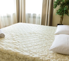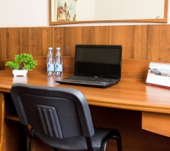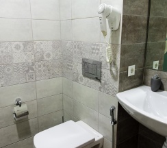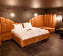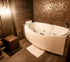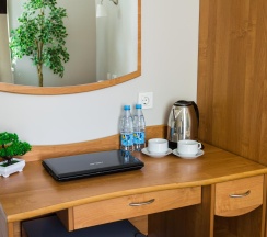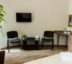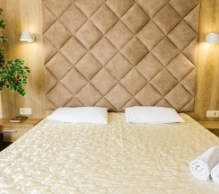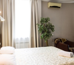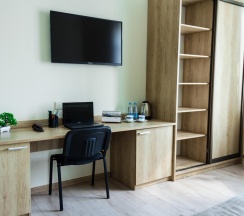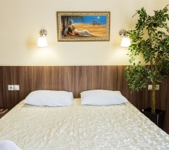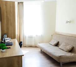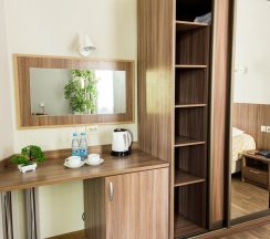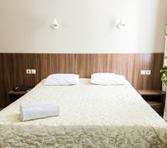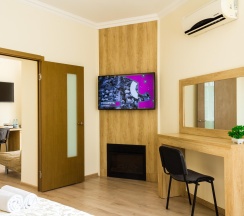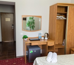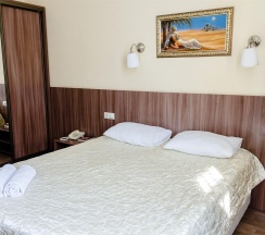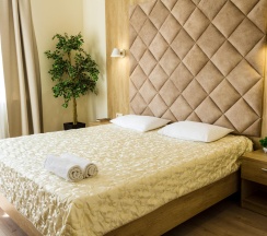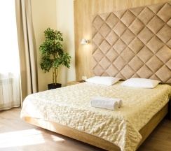 Номер площадью 30 кв. метров выдержан в цветовой гамме теплых оттенков и идеально сочетает в себе стиль и комфортность. С двухместной кроватью 200*160см с ортопедическими матрасами и гипоаллергенным белым постельным бельем из чистого хлопка, цифровое ТВ, холодильником, кондиционером, сейфом, wi-fi, телефоном для внутренней связи, гардеробом, просторным рабочим столом, средством для читки обуви, набором для приготовления чая/кофе, одноразовыми тапочками. Душевая комната в современном стиле, оснащена душевой кабиной, косметическим подвесным зеркалом, банными полотенцами, туалетными принадлежностями, средствами личной гигиены.