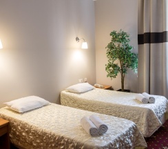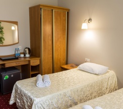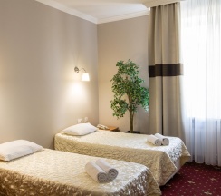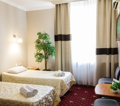 Номер категории «Двухместный Стандарт» общей площадью 25кв. метров выдержан в цветовой гамме теплых оттенков и идеально сочетает в себе стиль и комфортность. Номер оснащен двумя раздельными кроватями 200*80см с ортопедическими матрасами и гипоаллергенным белым постельным бельем, цифровое ТВ, холодильником, кондиционером, сейфом, wi-fi, телефоном для внутренней связи, гардеробом, просторным рабочим столом, средством для читки обуви, набором для приготовления чая/кофе, одноразовыми тапочками. Душевая комната в современном стиле, оснащена душевой кабиной, косметическим подвесным зеркалом, банными полотенцами, туалетными принадлежностями, средствами личной гигиены.