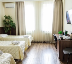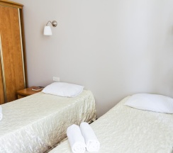 В номере: 1 двуспальная (с возможностью разделения на 2 отдельные кровати) и 1 односпальная кровати, ванная комната со всеми удобствами, Телефон, Спутниковые каналы, Телевизор с плоским экраном, Холодильник, Будильник, Полотенца, Белье.