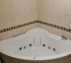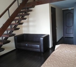 Номер 2-х ярусный. Семейный. На нижнем ярусе – гостиная в которой находится шкаф для одежды, холодильник, кожаный диван и кресло, журнальный стол, телевизор и холодильник. А так же туалет, душ и джакузи. В номере 1 двуспальная и 2 односпальные кровати