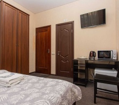 В номере: двуспальная кровать,ванная комната, туалет, кондиционер, телевизор с плоским экраном, письменный стол, шкаф, Wi-Fi, микроволновая печь, холодильник.
