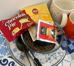 Для приятного: печеньки, чай в пакетиках, кашка быстрая, сахар,