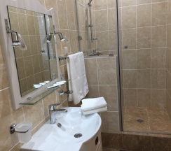 Небольшой номер с двухспальной кроватью и санузлом с душевой кабиной.