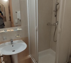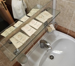 Присоединюсь к другим отзывам, одноразовые наборы гигиенические могли бы разместить в ванных комнатах, учитывая, что доплату вы за них просите 25-35р, не помню точно. Шапочки для душа кладете, а элементарно зубную пасту – нет. Ванная комната тесновата, но быстро привести себя в порядок – подойдет.