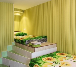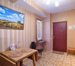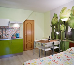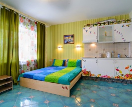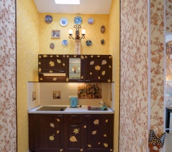 Для своей цены, этакий дизайн от домохозяйки пойдет. Персонал доброжелательный. Огромный плюс в наличии кухни. Но в номерах такого формата ОБЯЗАТЕЛЬНО должны быть: микроволновка, гладильная доска и сушилка. Но этого всего нет. Как правило в таких номерах есть духовка, стиральная машина. Но и этого конечно нет. Телевизор очень маленький. Негатива от проживания нет.