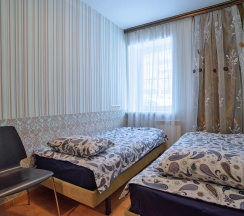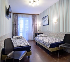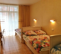 Стандартный номер гостиного дома "12 месяцев" - это двухкомнатный номер с балконом, туалетом и душем.