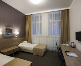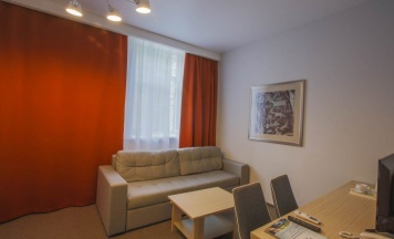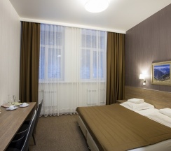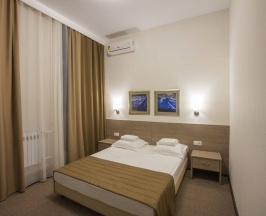 Уютный номер с удобной современной мебелью. Одна полутораспальная или двуспальная кровать (ортопедический матрас производства Германия с чехлом из высококачественного гипоаллергенного жаккарда), туалетный столик, встроенный холодильник, ЖК-телевизор, кондиционер, кресла, прикроватные тумбы, в прихожей встроенный шкаф для одежды, сейф.