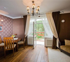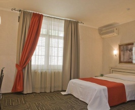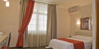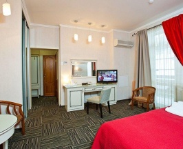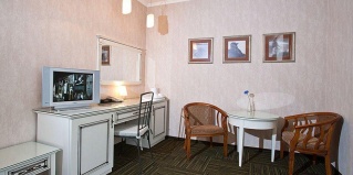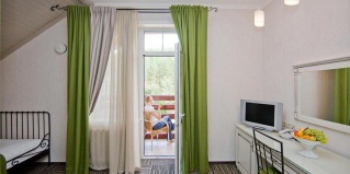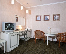 Этот отель относится к отелю "Россия", но стоит отдельным зданьицем чуть поодаль. Место отличное: у нас было два двухместных номера, каждый из которых просто поражал своими размерами. Очень просторно, уютно, есть всё необходимое: помимо стандартных кровати/тумбочек/шкафа есть отличный письменный стол, гладильная доска с утюгом, сушка и большой балкон, на котором стоят стол и стульчики: родители мои, например, облюбовали это место и по вечерам сидят играют там в карты.