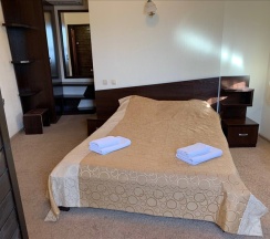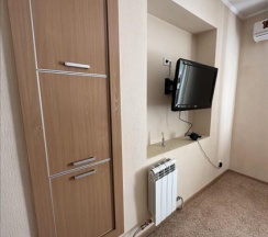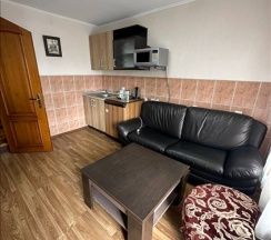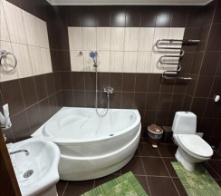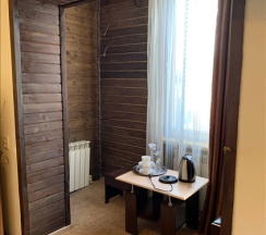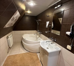 Двухуровневый комфортабельный, просторный номер 35 кв.м. для 4 человек, с двумя спальнями и гостиной. Завтрак включён! В номере кухня с мини-холодильником, журнальным столиком, диваном, раковиной, посудой, чайником, микроволновкой и всем необходимым. В каждой комнате: двуспальная кровать, индивидуальная ванная комната, шкафы для одежды, комод. А так же кондиционер,ТВ, WI-FI, тапочки, полотенца, плечики для одежды, фены, средства личной гигиены. В отеле функционирует ресторанчик, где Вы можете позавтракать, не покидая пределов отеля, что очень удобно. На территории отеля расположена баня "Богатырский дух" .Так же есть бесплатная парковка с видеонаблюдением.