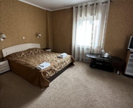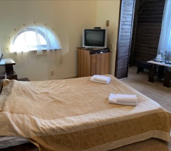 Двухкомнатный просторный номер с включённым завтраком! В номере двуспальная кровать King Size и раскладной двуспальный King Size диван, журнальный столик, шкафы для одежды, ниши, мини-холодильник, чайник, кондиционер, ТВ, WI-FI, чайный сервиз, полотенца, плечики для одежды, фен, средства личной гигиены,ванна. В отеле функционирует ресторанчик, где Вы можете позавтракать, не покидая пределов отеля, что очень удобно. На территории отеля расположена баня "Богатырский дух". Так же есть бесплатная парковка с видеонаблюдением.