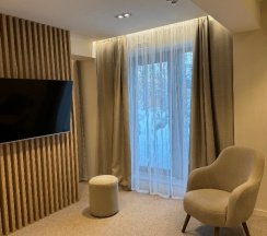 Персонал очень вежливый. Номер брали один из самых обычных - но комплектация приятно удивила: халаты, косметические принадлежности, полотенца даже для выноса в бассейн предусмотрены. На окнах москитные сетки и Раптор лежит. Много плечиков в шкафу и чайная станция на столе. В ресторане вкусно, выбор есть, официанты постоянно уносят грязную посуду и приносят недостающую еду. Нереальная творожная запеканка на завтраке! Хорошая детская комната и площадка на улице, бассейн супер. Бани жаркие. Территория очень красивая, тихо, спокойно 👍 из минусов могу отметить только кровать, которая сдвинута из двух односпальных, наматрасник по центру проваливается, а матрасы через чур мягкие, не для людей с больной спиной как минимум. Розеток немного в номере, но это обусловлено датой постройки здания. На тв мало каналов, но мы ж не телевизор приехали смотреть )))) В общем и целом очень советую!