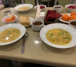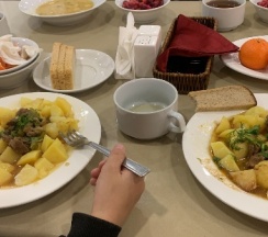 У нас было питание по системе «шведский стол», что очень удобно. Каждый для себя найдет то, что любит покушать и можно взять в необходимом объеме. Всегда на выбор 3-4 вида супа, на горячее - мясо, курица, рыба, все виды гарниров. Свежие овощи и фрукты есть всегда. И конечно же большой выбор вкусной выпечки. Большое спасибо поварам. Все приготовлено так вкусно, «по-домашнему», что часто идешь за добавкой. Единственный минус – не похудеешь, потому что все хочется попробовать. Отдельное спасибо обслуживающему персоналу столовой. Посуду убирают моментально, но делают все очень деликатно, стараясь не мешать отдыхающим. Из рекомендаций хочется пожелать побольше овощных салатов, например из свежей капусты, моркови и дт.