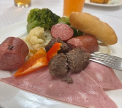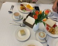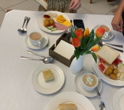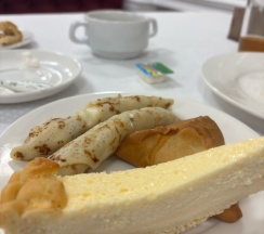 Завтрак обычный, выбор не большой, но все свежее, вкусное. Выделю кашу, творог, сметану, сыры, яблочный пирог, эчпочмаки и губадию. Официанты убирают посуду практически сразу.