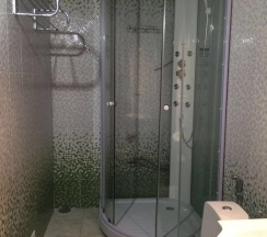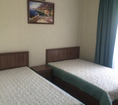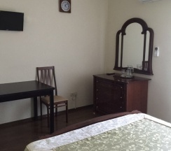В целом уютный номер, но маленький, очень компактно. Ремонт старенький. Дали полотенца (большое и маленькое на каждого), также полотенце под ноги в душевой. Гигиенического набора не дают. Но было жидкое мыло. На столике график и два стакана. Телевизор, кондиционер, фен. Также на кухне микроволновка, чайник, холодильник. Для каждого номера дается пронумерованная корзинка для хранения продуктов.
