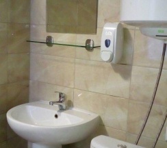 Также на первом этаже расположены две спальные комнаты, в каждой из которых стоит двуспальная кровать, и санузел с душевой кабиной.