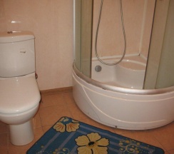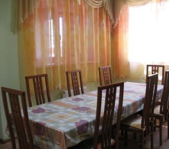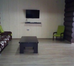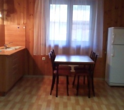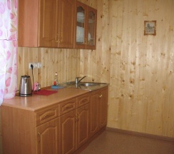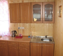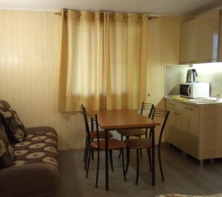 Оснащение: круглый стол с шестью стульями, вместительный холодильник, оснащенный морозильной камерой, индукционную варочную поверхность, духовку, микроволновую печь, электрочайник, индукционную кастрюлю и набор посуды на 12 персон.