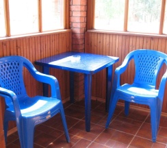 Ванная комната с душем и туалетом. Веранды открытая и закрытая с комплектом пластиковой мебели. Возле коттеджа установлен мангал.