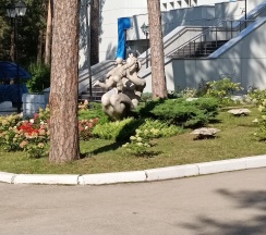 Очень ухоженная территория, цветы, фонтан, сосны, скамейки, лежаки в тенечке, качели.