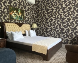 В номере: Двуспальная кровать, прикроватные тумбочки, небольшая обеденная зона с набором посуды, электрический чайник, мини-холодильник, ЖК телевизор, телефон.