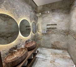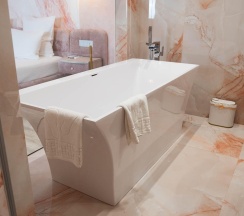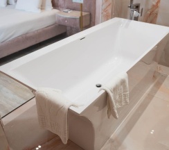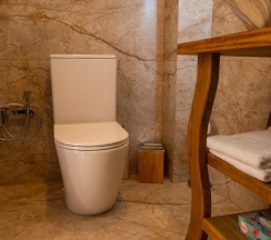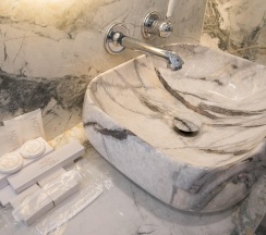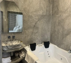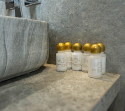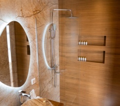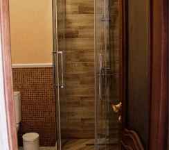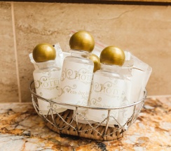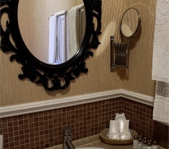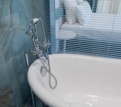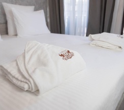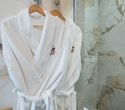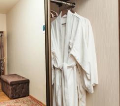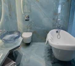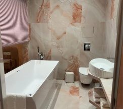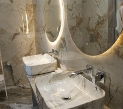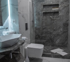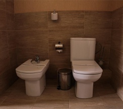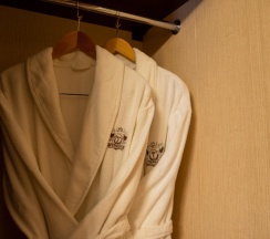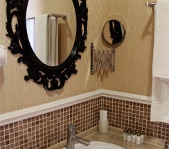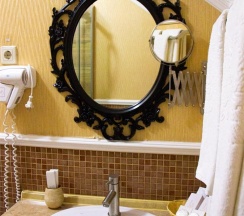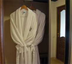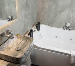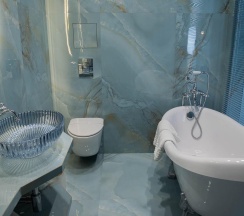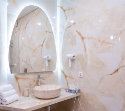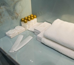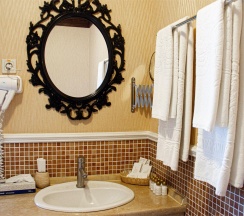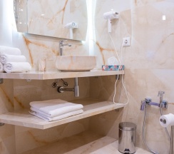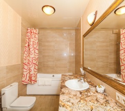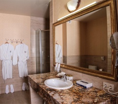 Гостям отеля понравится ванная комната в номере, т.к. она оборудована отличной и красивой сантехникой. Ванная комната: ванна, банные полотенца, банные принадлежности (мыло, гель для душа, лосьон для тела, шампунь для волос, кондиционер для волос, шапочка для душа, расческа), туалетные средства (зубной набор - зубная щетка + паста, бритвенный набор - станок одноразовый + крем для бритья), ватные палочки и диски, пляжные полотенца, раковина, санузел, биде, тапочки, халаты, фен.