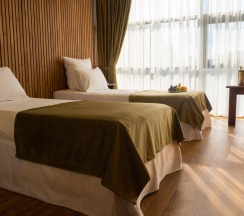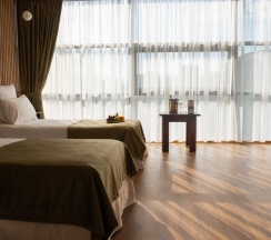 Номер выполнен в бежевых пастельных тонах, из гостевой зоны с панорамными окнами открывается великолепный вид на бассейн и территорию комплекса, напольное покрытие в номере — ламинат. Рассчитан на размещение max. 2 взр + 2 реб (0-3 года без места или детская кроватка; 3-12 лет доп.место - раскладушка), максимальное размещение - 4 гостя.