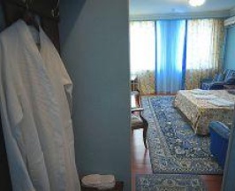 В номере: двуспальная кровать, прикроватные тумбочки, стол, стулья, шкаф, холодильник, мягкая мебель, телевизор, телефон, сплит-система, сейф, санузел с ванной, фен, комплект полотенец, халат, набор косметических принадлежностей, тапочки.