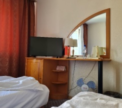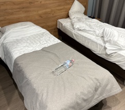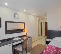 Проживали в этой гостинице неделю, куча китайцев, очень шумно, из средств гигиены есть только гель для душа, щетки, фен. В номере был большой шкаф, много полотенец, большая кровать с немного уставшим бельем, были пятна, облезшие батареи, мебель тоже требует замены, кондиционер, фен, телевизор. Вроде бы и неплохо: центр города, хорошее расположение, но требуется ремонт. В номере чисто.