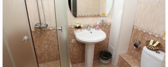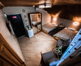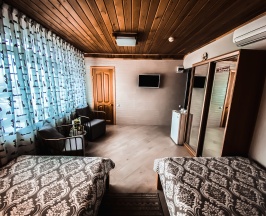 - комната: система кондиционирования, двуспальная кровать с ортопедическим матрацем +2-х ярусная кровать, стол, ТВ, халаты, тапочки, ванная комната с душевой кабиной и туалетными принадлежностями.