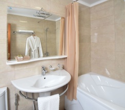 В номере: большая двух спальная кровать, 2 прикроватные тумбы, отдельная рабочая зона, шкаф для одежды, подставка под багаж, зеркало, кожаный диван с креслом, журнальный столик. Номер оснащен, доступом в Интернет, холодильником, сейфом, чайной станцией (чайник, чайный набор, чай, сахар, шоколад). Санузел с душевой кабиной, феном, зеркалом для макияжа, мини-набором для ванной, халатом, тапочками.