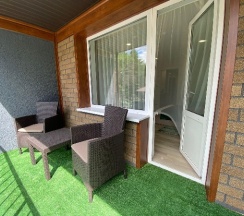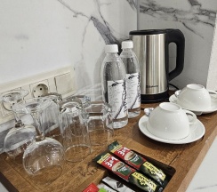 1) Не хватило какого-нибудь стола (обеденного, журнального, любого) внутри номера, площадь вполне позволяет это сделать. ёЕсть небольшая зона готовки с чайником, кофеваркой, тарелками, но покушать по факту негде. Да, можно на веранде или у мангальной зоны, но не всегда погода это позволяет.