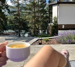 Жили в шале студия, классный домик со своей верандой, мангальной зоной и всем (почти), что нужно.