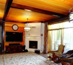 На 1 этаже: гостиная с витражными окнами и выходом на террасу, камин, диван, журнальный столик, телевизор, оборудованная кухонная зона (кухонный гарнитур, холодильник, духовой шкаф, плита, вытяжка, раковина, микроволновая печь, чайник, набор посуды).