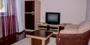 Гостиная: мягкая мебель, журнальный столик, шкаф, ТВ; спальня: двуспальная кровать, гардероб с вешалками для одежды, тумбочки.