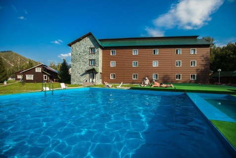 Большая зеленая ухоженная территория с собственным спуском на Катунь. На берегу много мангальных зон с лавочками и столиками-очень круто. Бассейн нормальный: детский и взрослый, насколько я поняла не подогреваемый.Есть детская площадка и батут- ребенок там хорошо позависал. Ресторан на территории дорогой, но вкусный. На выходе с базы есть узбечка с бюджетным меню. Номер дабл хаус отличный, терраса особенно. В целом все хорошо, мы остались довольны.
