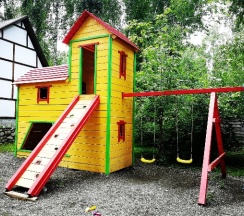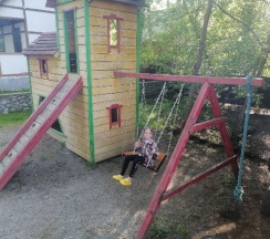 На территории в нашем распоряжении были беседки, а специально к нашему домику поставили мангал и предоставили решетку и шампуры. Рядом была детская площадка с качелями. На территории чисто, красивый осенний вид.