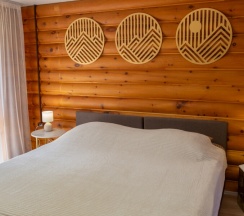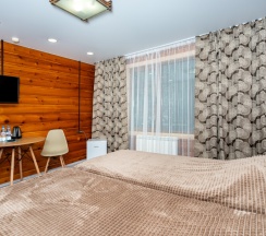 Новые двухместные номера, повышенной комфортности с панорамными окнами, из которых открывается великолепный вид на территорию отеля и горы. Номера «Делюкс» располагаются в обновленных коттеджах из алтайского кедра.
