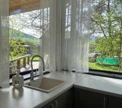 Из минусов: отсутсвие в домике фена (но это мое важное пожелание), и из-за того, что обогрев в домике идет на основную комнату, в санузле немного влажновато и утром пол в душевой очень холодный.