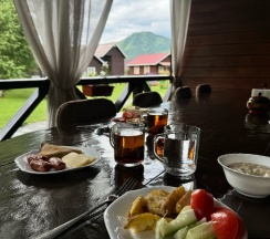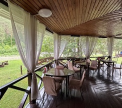 Территория большая, красивая, ресторан, бесплатный завтрак ( входит в стоимость номера) , беседки, речка вдоль базы, виды прекрасные, в домиках очень уютно! На территории базы детская площадка, территория ухоженна!