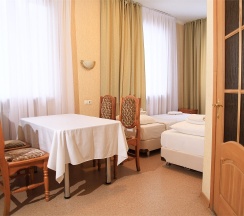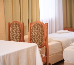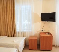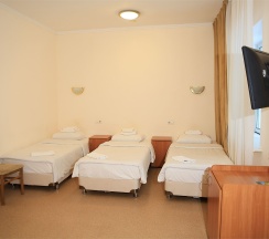 Просторные и светлые трехместные номера категории «Стандарт» созданы для вашего комфорта. В каждом номере вас ждет: удобные односпальные кровати, легко трансформирующиеся в одну двуспальную, вместительный двухстворчатый шкаф с плечиками для одежды, холодильник для хранения продуктов и напитков, телевизор с пультом для приятного времяпрепровождения, журнальный столик для вечернего чаепития, тумбочка, стул и зеркало. Мы также позаботились о необходимых мелочах: банные и лицевые полотенца, а также пеленка для медицинских процедур уже ждут вас в номере. Индивидуальная туалетная комната с душевой кабиной обеспечит максимальное удобство и приватность.
