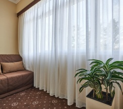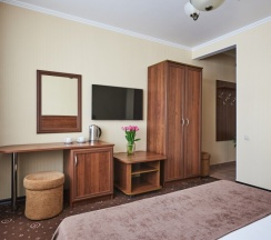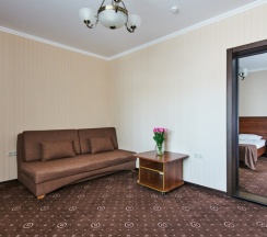 Полулюкс двухкомнатный – это комфортный номер с двумя раздельными комнатами. В гостиной комнате расположен двуспальный диван, в спальной комнате - двуспальная кровать. В номере могут с комфортом разместиться семья из четырех человек + без дополнительного места и без дополнительной оплаты может проживать ребенок в возрасте до 4 лет. Собственный санузел с ванной. Номер оснащен индивидуальным кондиционером и имеет доступ к сети Wi-Fi. Из оснащения также - телевизор, холодильник, фен, шкаф для одежды. Для комфортного пребывания есть журнальный столик с креслами. В санузле для вашего удобства есть жидкое мыло, шампунь-гель для душа, туалетная бумага, комплект полотенец (для ног, лицевые и банные).