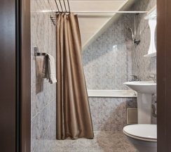Полулюкс с балконом – это номер для 4-х взрослых - с двуспальной кроватью и двуспальным диваном. Расположение номеров с третьего по шестой этаж. Напольное покрытие - ковролин. В номере имеется холодильник, телевизор, кондиционер сплит-система, фен, есть небольшой столик, электрочайник, стаканы. В номере собственный санузел, в котором установлена ванная . Номера комплектуются набором полотенец на каждого гостя (банное, лицевое и полотенце для ног). В ванной комнате есть жидкое мыло, шампунь ,гель для душа . В номере есть балкон. В номере без предоставления дополнительного места и без дополнительной оплаты может проживать ребенок в возрасте до 4 лет (4+1) .