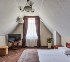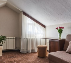 Двухкомнатный люкс с лоджией – это комфортный номер с двумя раздельными комнатами. В гостиной комнате расположен двуспальный диван, в спальной комнате - двуспальная кровать. В номере могут с комфортом разместиться семья из четырех человек + без дополнительного места и без дополнительной оплаты может проживать ребенок в возрасте до 4 лет. Собственный санузел с ванной. Номер оснащен индивидуальным кондиционером и имеет доступ к сети Wi-Fi. Из оснащения также - телевизор, холодильник, фен, шкаф для одежды. Для комфортного пребывания есть журнальный столик с креслами. В санузле для вашего удобства есть жидкое мыло, шампунь-гель для душа, туалетная бумага, комплект полотенец (для ног, лицевые и банные). Номера Двухкомнатный люкс с лоджией расположены на третьем этаже. В номере есть лоджия.
