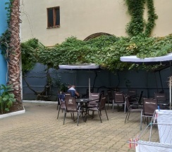 - небольшой, но уютный дворик с теневым навесом из виноградной лозы, зонтиками от дождя, столами и стульями;