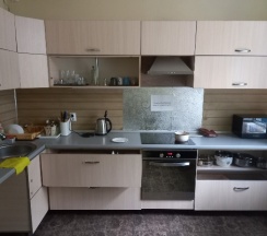 - общая кухня на первом этаже (в наличии: посуда (кастрюли, сковородки, тарелки, вилки, ложки и т.п.)), эл. плита, микроволновка, холодильник, эл. чайник, мойка);