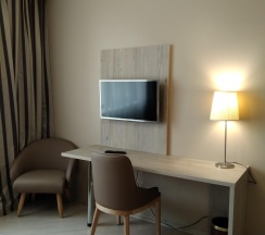 Бронировали через S7. Номер стандарт Есть:холодильник, тв, сейф, фен, ночники,торшер,лампа,кресло,тумбочки. Каждый день пополнение вода питьевая, чай,сахар,кофе, паста, щетки, бритва, шампунь и кондиционер. В номере чайник,бокалы;полотенеца для душа/бассейна,тапочки, мыло, пакеты, белые халаты. Большой шкаф и много зеркал. Большой минус- на 2 этаже нет балкона. Вид из окна в двух метрах соседнее здание- не прилюдное(((( шторы поэтому всегда закрыты. Шторы-блэкаут.С уборкой проблем не было.Территории нет!