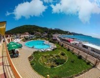 В отеле есть свои плюсы и минусы! Жили в 2-х местном стандартном номере с видом на море в конце августа 2019 г. В номере представляют постельное бельё, полотенца, 2 стакана, туалетная бумага, мыло. Что касается питания : оно 3-х разовое, несколько блюд на выбор - голодным точно не будешь! Но любителям жареной курочки и фастфуда не понравиться, тк еда по типу "правильное питание" тушоно-запеченное :каши, кефир, макароны, крупы, овощи, мясо, рыба, соусы, сок, чай, кофе, молоко, сосиски, творог, печенье, мармелад, хлеб - вполне достаточный рацион чтоб наесться 😉 На территории есть бассейн взрослый и детский, но вода холодная! Есть детская площадка! Главный плюс - отель стоит на берегу моря, рядом кафе, рынок, развлекалки разные! Минус - санитарное состояние номера! Ковёр в мелких волосах, словно собачка жила! Душевая кабина грязная, вечно забивается! Унитаз и раковина тоже чистотой не блещут! Но это не испортило нам отдых - общее впечатление о отели осталось положительное! Если планируете здесь отдыхать, захватите с собой необходимую вам посуду, тазик для стирки (они есть в отели, но я бы по рекомендовала свой) и прищепки для белья😉