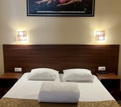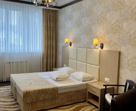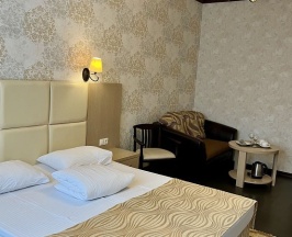 Номер оснащен удобной современной мебелью: двуспальной «французской» кроватью с прикроватными тумбочками и настенными бра и удобными креслами, шкафом для одежды и вещей, журнальным столиком, набором посуды, бокалов и фраже.