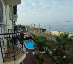 Отличный комплекс. Есть два бассейна, рядом с пляжем, детская анимация, при желании можно оплатить и кушать в ресторане. Стены толстые, рядом железная дорога - но из-за качественных материалов ее не слышно. Спали под шум прибоя, когда начинали ездить поезда - закрывали дверь. Даже бар, работающий на пляже нам не мешал. Хозяин с душой строил данную гостиницу, на материалах не экономил. Мы живем в третьем корпусе, номер 41. Вид из окна на море. На фото вид из номера.