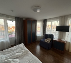 В номере есть все необходимое (большая кровать, раскладной диван, ТВ, кондиционер, мини холодильник, фен, эл.чайник, чайные кружки, одноразовые тапочки, шампунь и гель для душа поштучно, тазик для стирки), чисто и уютно. На каждом этаже кулер с питьевой водой. У каждого номера снаружи сушилка для одежды. Уборка через день, смена полотенец раз в 3 дня, смена белья раз в 5 дней.