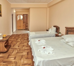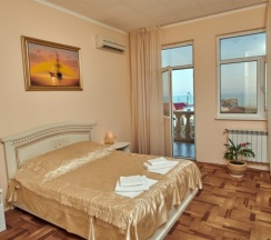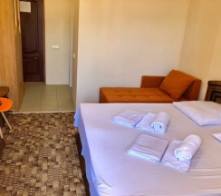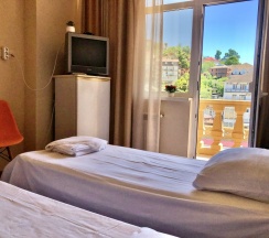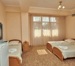 Номер категории семейный это одна комната размером от 20м2 до 25м2, укомплектован двуспальной кроватью и односпальной кроватью, либо три односпальные кровати, и дополнительное место софа размером 80см Х 2м, в некоторых номерах доп.место раскладная кровать. Все номера с балконами , с прямым либо боковым видом на море, и есть номер с видом на посёлок, в противоположную сторону от дороги и по этой причине считается более тихой стороной. Во всех номерах санузел с душем, кондиционер, косметические принадлежности, фен, холодильник, чайник и чашки, столик журнальный, стулья в номере и на балконе, шкаф для одежды, прикроватные тумбочки